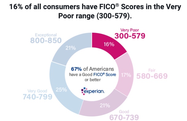 A credit score between 300 and 579 is considered very poor. See the diagram below. [Source] Only about 16% of consumers have scores in this range.