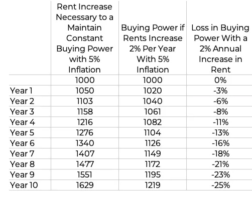 However, just because Property B’s rent did not keep pace with inflation, does not mean that the rent did not increase. For example, if the inflation rate is 5% and the rent increases by 5% per year, there is no actual increase; the rent only kept pace with inflation. This is what occurred with Property A. On the other hand, Property B’s rent rose by only 2%, which did not keep pace with inflation, resulting in a decrease in buying power over time. See the table below.