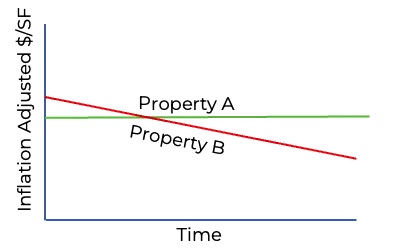 Relying primarily on initial returns when making purchase decisions can result in poor long-term results. For example, the chart below shows the inflation-adjusted rent (or buying power) over time for two properties. The rent for Property A kept pace with inflation, while the rent for Property B did not.