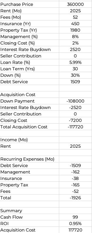 ROI = (Rent – DebtService – ManagementFee – Insurance – RealEstateTax – PeriodicFees) / ( DownPayment + ClosingCosts)