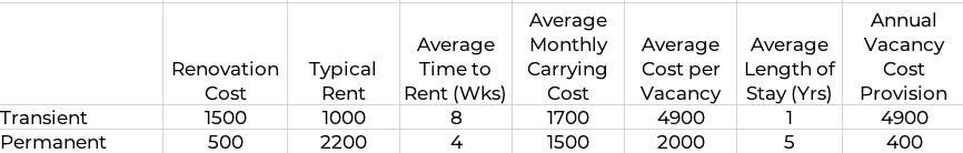 With an average tenant stay of over five years and a typical time to rent of one month, the average vacancy cost is approximately $400/Yr.