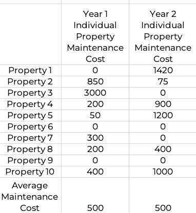 As shown in the table below, the average annual maintenance cost for the ten properties is $500 for years 1 and 2. However, maintenance costs for individual properties varied widely. This is why population averages are not representative of the individual properties within the population. This was the issue I faced when deciding whether to include population averages for maintenance and vacancy costs.