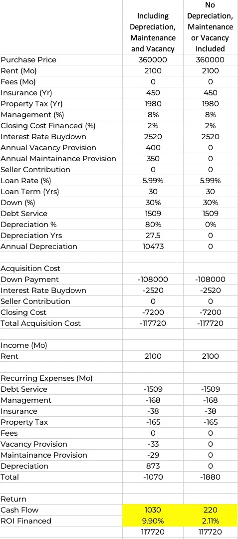 If I included maintenance and vacancy costs and depreciation, the cash flow is $917/Mo. Not including maintenance and vacancy costs and depreciation, the cash flow is $107/Mo. Not including depreciation, vacancy, and maintenance is a much more conservative approach as shown in the above table. This is why I chose this method.