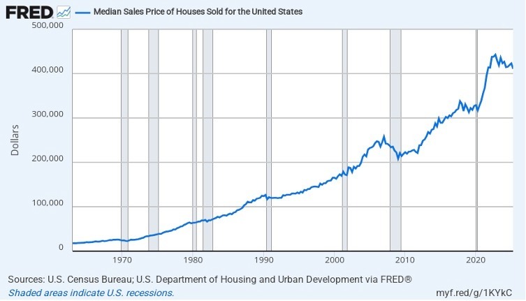 Track records also show that real estate can work very well for wealth creation. Below is a chart showing the median home sales price in the U.S. in the past 60 years. Although real estate markets are highly local, the concept is valid.