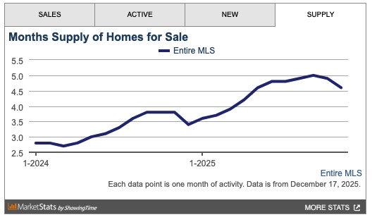 Below are charts from our latest trailing 13-month market report, which includes November data. Remember that this data is only for our target property profile, not the entire metro area. The chart below, from the MLS, includes ALL property types and price ranges. The overall inventory is trending down.