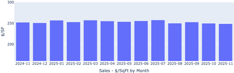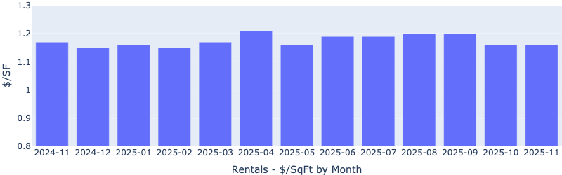Rents were flat MoM. The median $/SF has remained in a tight band of $1.16/SF and $1.20/SF for the past 13 months.