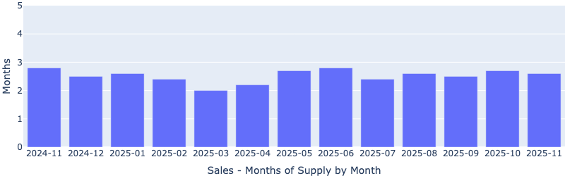 Sales inventory has remained in a tight band around 2.5 months for the last several months, indicating a consistent seller’s market.