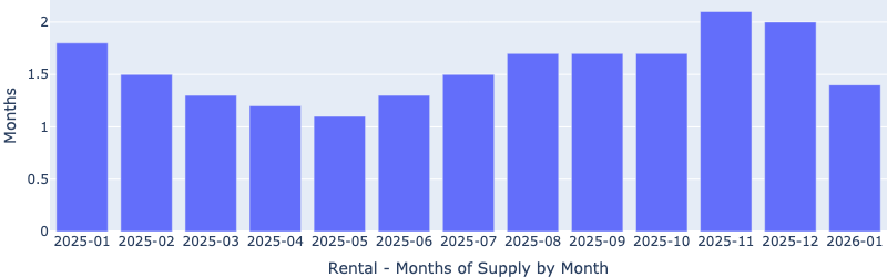 Rental inventory decreased significantly MoM, now at 1.4 months, indicating a landlord’s market.